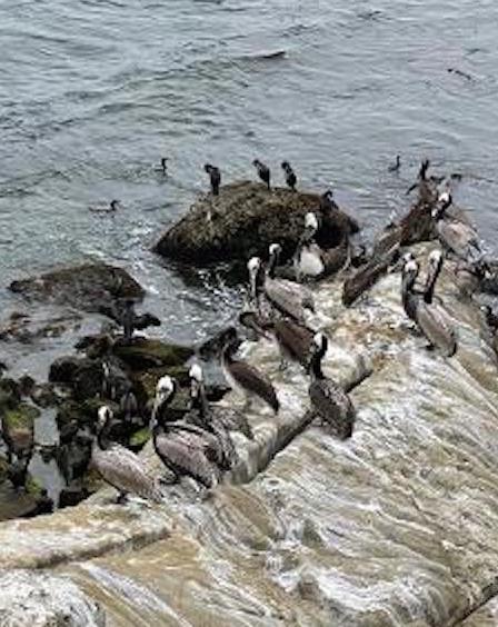 Pelicans rest in La Jolla then fly to island nests.